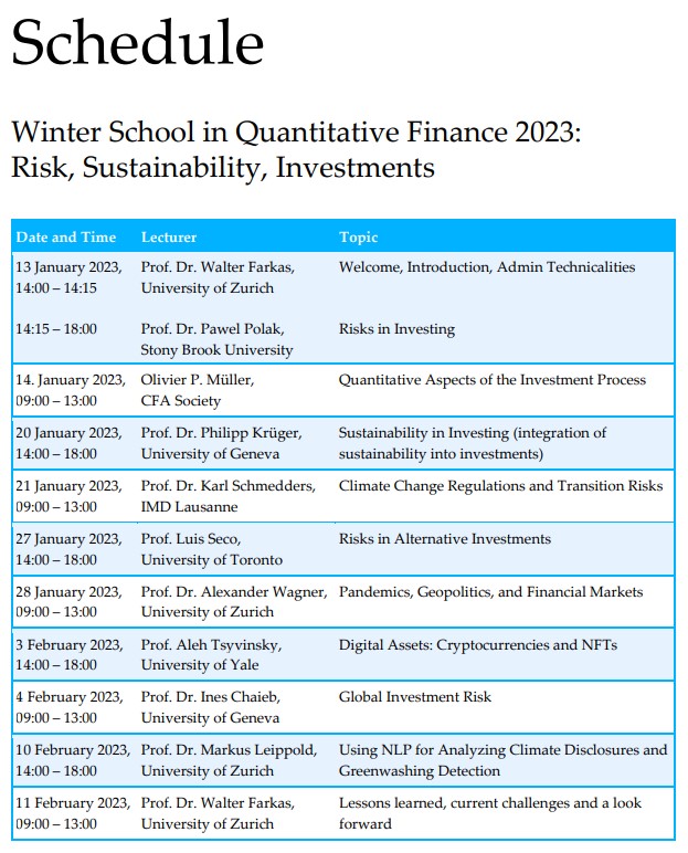 The University of Toronto, Canada and the University of Zurich, Switzerland will jointly launch a winter online program in Quantitative Finance. The main learning objective of the winter school is to provide in-depth knowledge of Risk, Sustainability & Investing, economics of climate change, alternative (non-mainstream) investment risk, geopolitical risk, digital assets, natural language processing (NLP) for analyzing ESG and climate disclosure and reporting. You will have a close interaction with ten professors from the University of Toronto, University of Zurich, ETH Zurich, the University of Geneva, State University of New York at Stony Brook, CFA Institute, International Institute for Management Development Lausanne, and Yale University over five weeks, and will have the opportunity to enhance your international literacy as well as to establish academic contacts with your mentors.