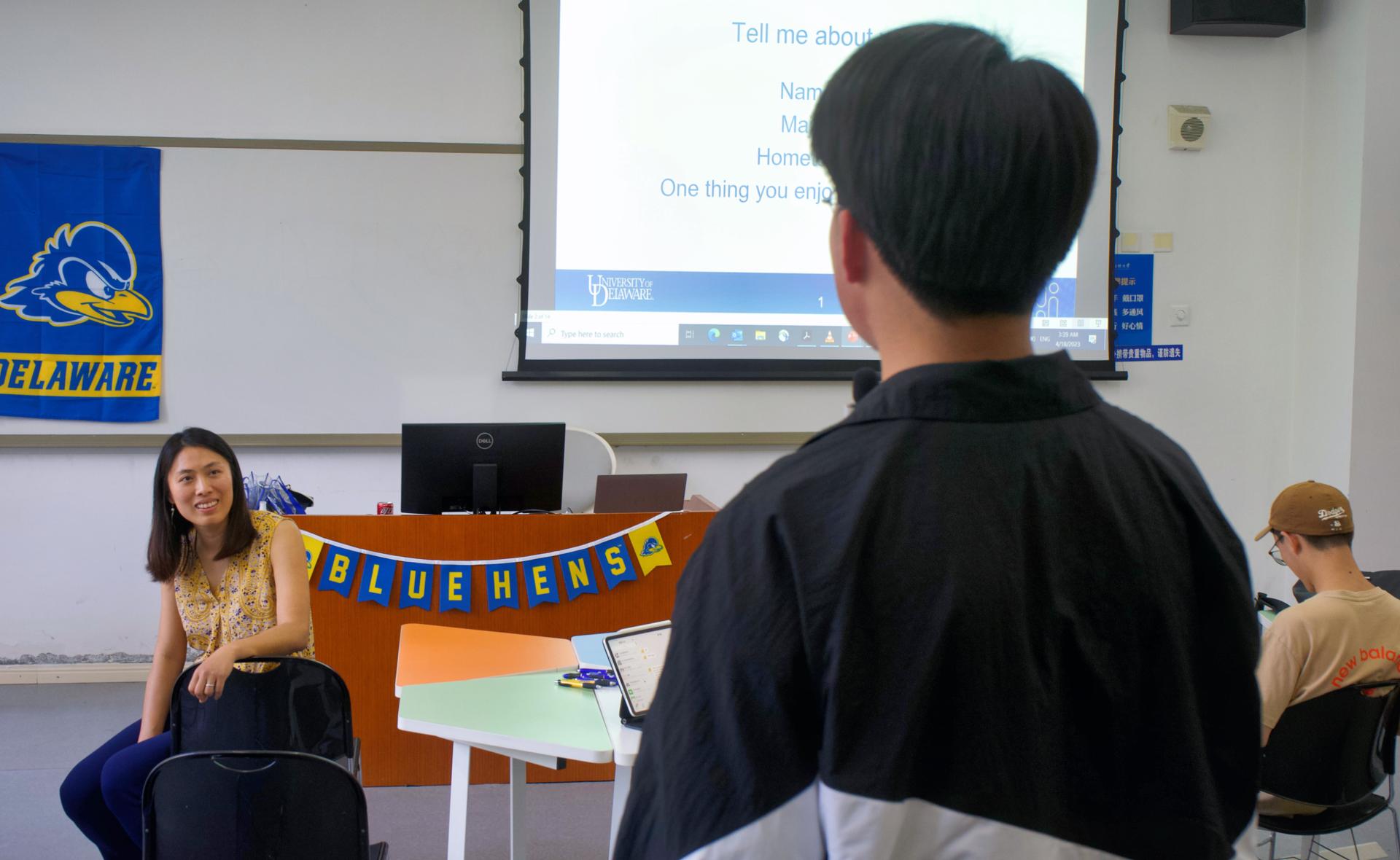 活动一开始,Dora与特院学子分别作自我介绍,分享自己的故乡与喜爱的事物,迅速拉近了老师和员工的距离。Dora向同学们简要介绍了特拉华大学,通过视频让大家感受到了特拉华大公司园的美丽风光。随后,Dora分享了特拉华大学为员工提供的丰富资源和机会,包括实习、研究和就业指导等,让同学们对未来的学习和发展充满了信心。