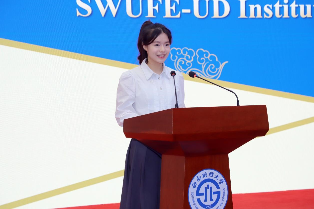 2023级新生代表赵卓妍同学在发言中表示,作为一名光荣的财大学子,要担负起经世济民的责任与担当,孜孜以求,与时偕行,以昂扬的激情奏响青春华章!