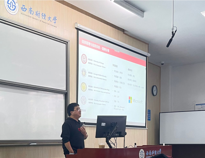 胡少飞老师以“人生抉择之再次崛起”为主题,详细为同学们讲解了大学的生涯规划。胡老师首先从特拉华数据科公司中美双学位背景优势、三大交叉专业的优势、西财商科专业国际认可度高等方面,帮助同学们深入了解了公司优势,紧接着通过数据对比,详细为同学们讲解了保研、考研、出国留学的要求,旨在帮助同学们明确自己的目标,更深刻的认识职业生涯规划。