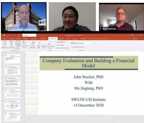 Professor John Stocker(Joint Program Director of Finance)delivered the first lecture with the topic of "Company Evaluation and Building a Financial Model" on December 14th. Professor Rick Andrews(Associate Dean of SWUFE-UD Institute of Data Science)attended the lecture,and Professor Ma Jingtang (Dean of School of Economic Mathematics at SWUFE and Joint Program Director of Finance) hosted the lecture and extended greetings to John and Rick.